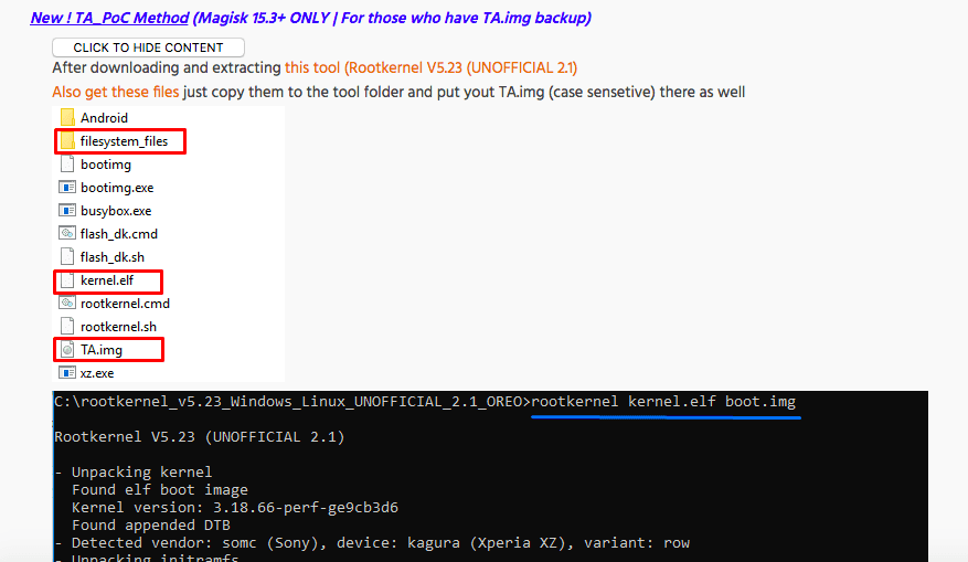 これをしました。ここでダウンロードできるものは全てXZ用です。成功するわけなかったんです。そしてTA.imgを用意するって書いてあるので先程バックアップしたTAパーティションのバックアップを同フォルダに入れ、実行しました。