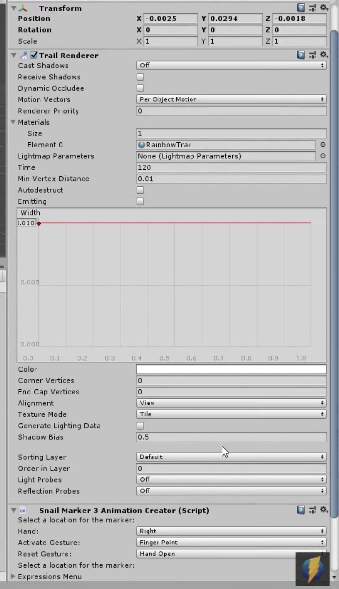 自分はUnity初心者なので、ザッとしか把握出来ていませんが、「Trail Renderer」がペンのインクの処理部分で、「Snail Marker 3 Animation Creator」というのが、以前の面倒くさい工程(アニメーションの作成など)をワンクリックで実現出来るようになったスクリプトの設定コンポーネントのようです。