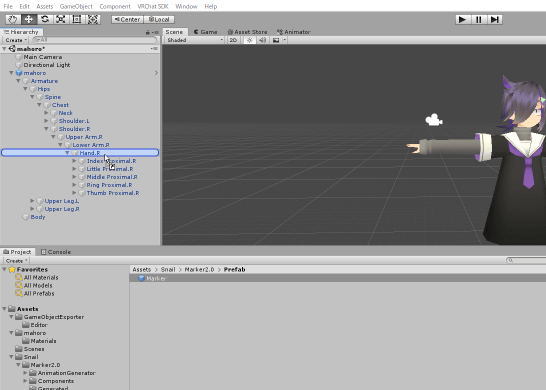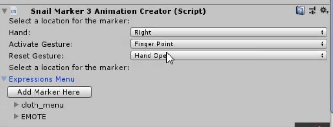 必須事項は「Snail Marker Animation Creator」の設定で、まずはHandで右利きか左利きの設定を確認してください。