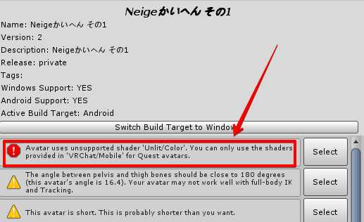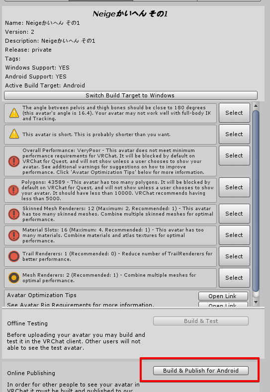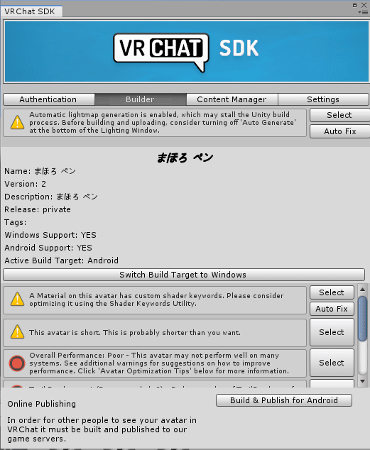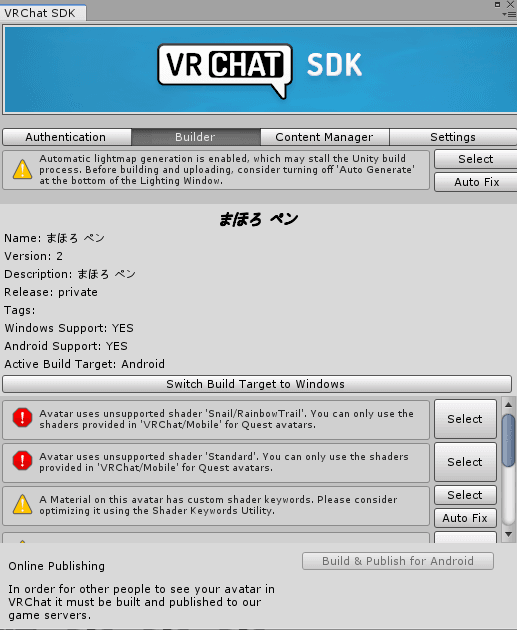 この記事では、一度はUnityでアップロードに成功したことのあるアバターであることを前提にしています。アバターアップロードに関しては沢山情報があると思うので、各自で調べてください。