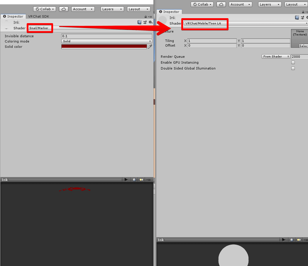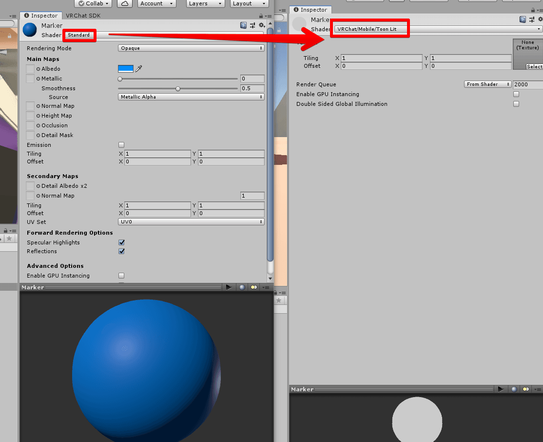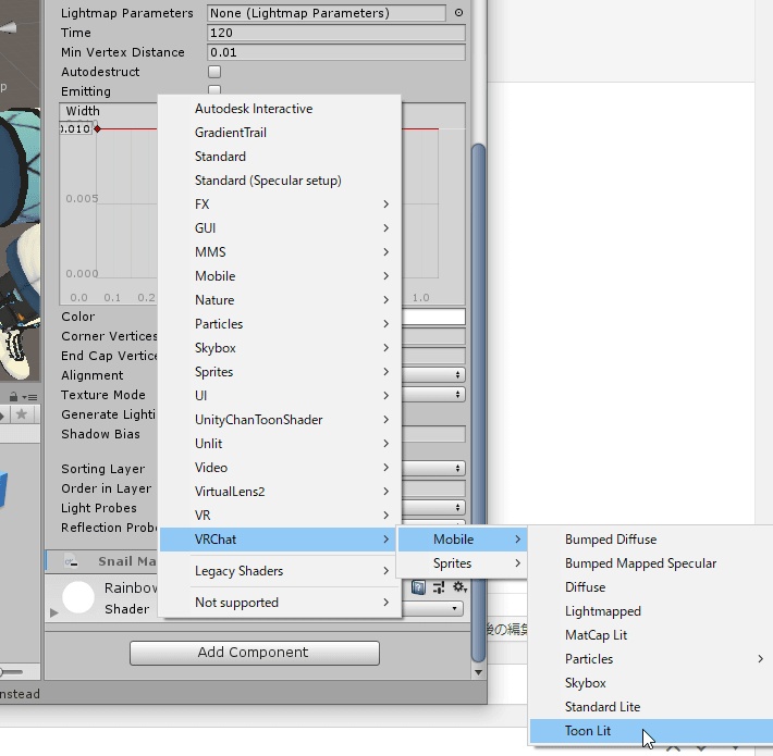 対処法は至って簡単で、配置したMarkerのInspectorに戻り、問題になるシェーダーをVRChat/Mobile/ToonLitに差し替えるだけです。