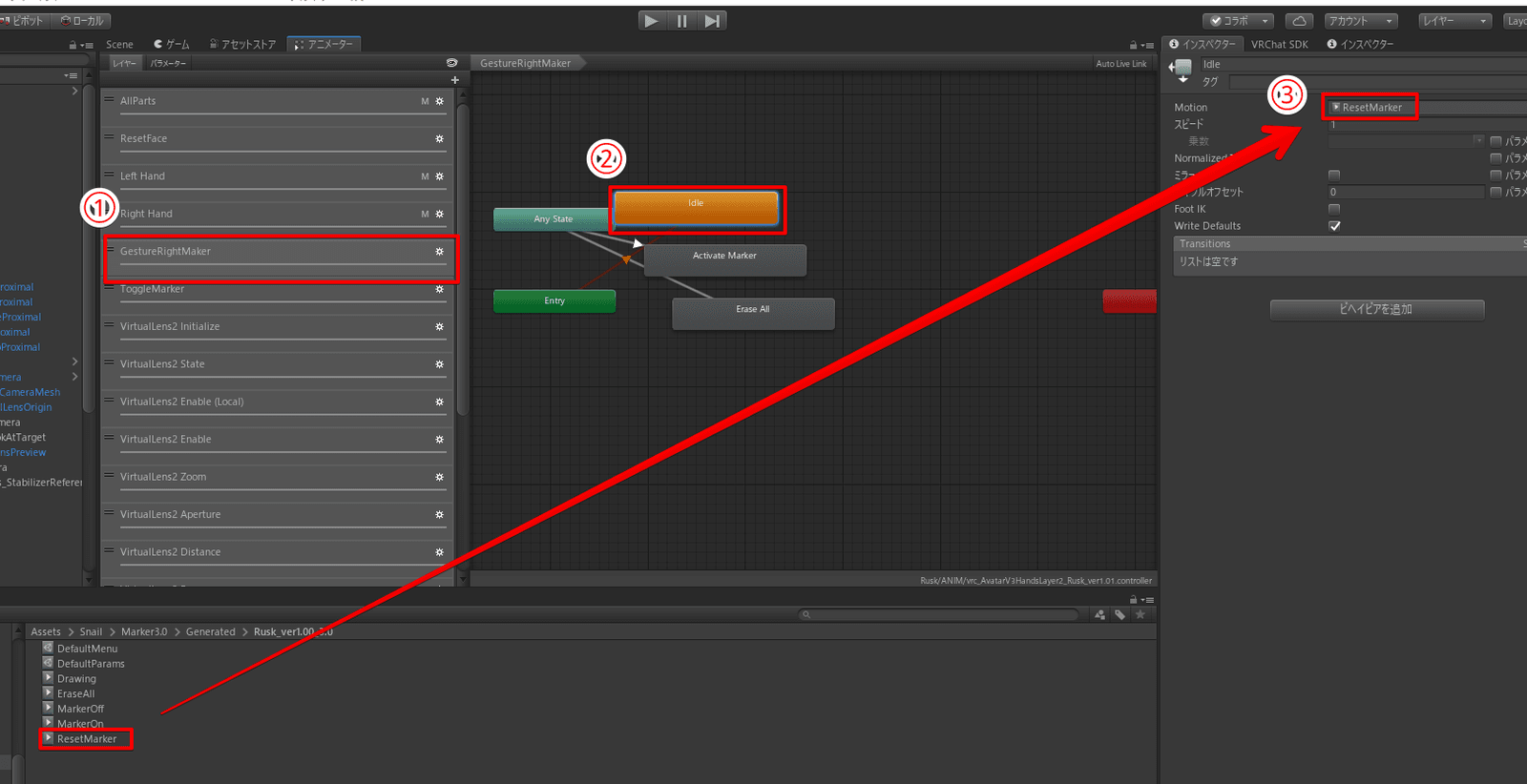 2.GesutureRight(Left)MarkerのIdleに作成したアニメーションを登録
