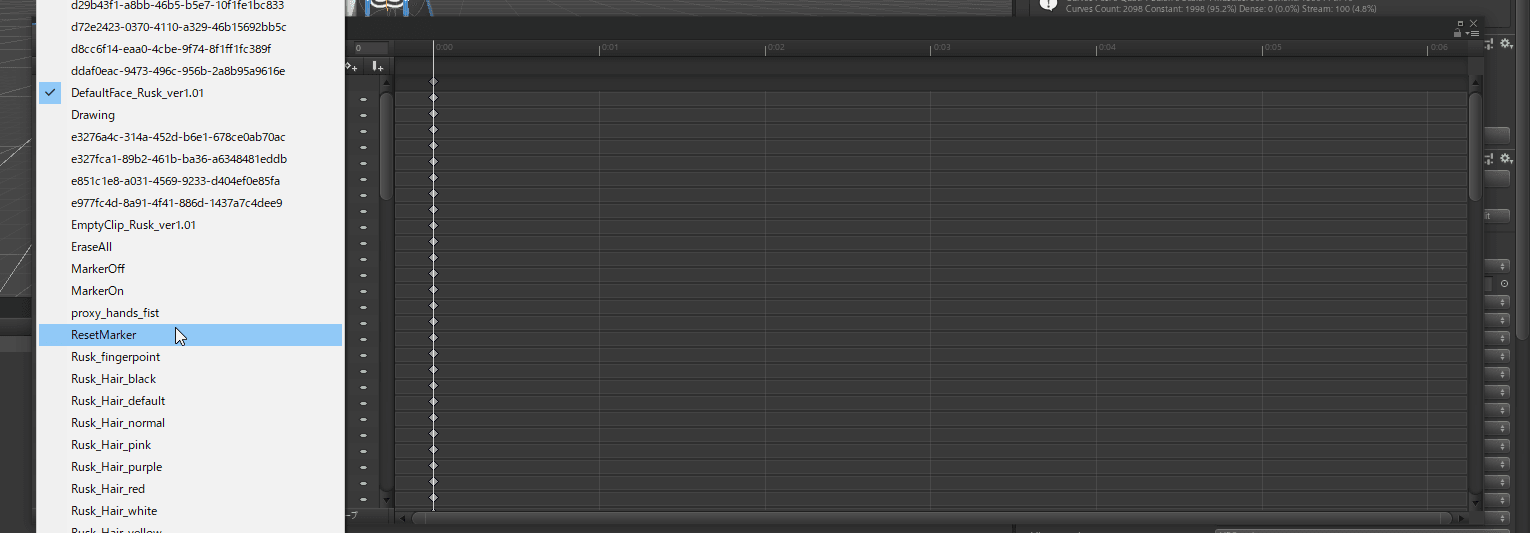 Animationウィンドウを開いたら、画像の赤囲み部分のメニューで先程設定したアニメーションを選択しましす。※ここでは「RestMarker」