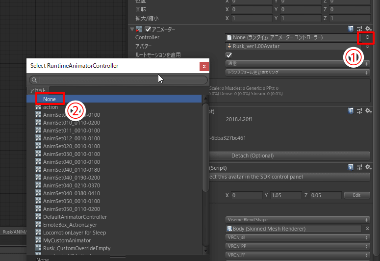 4. 3で登録したAnimatorのControllerをNoneに戻す