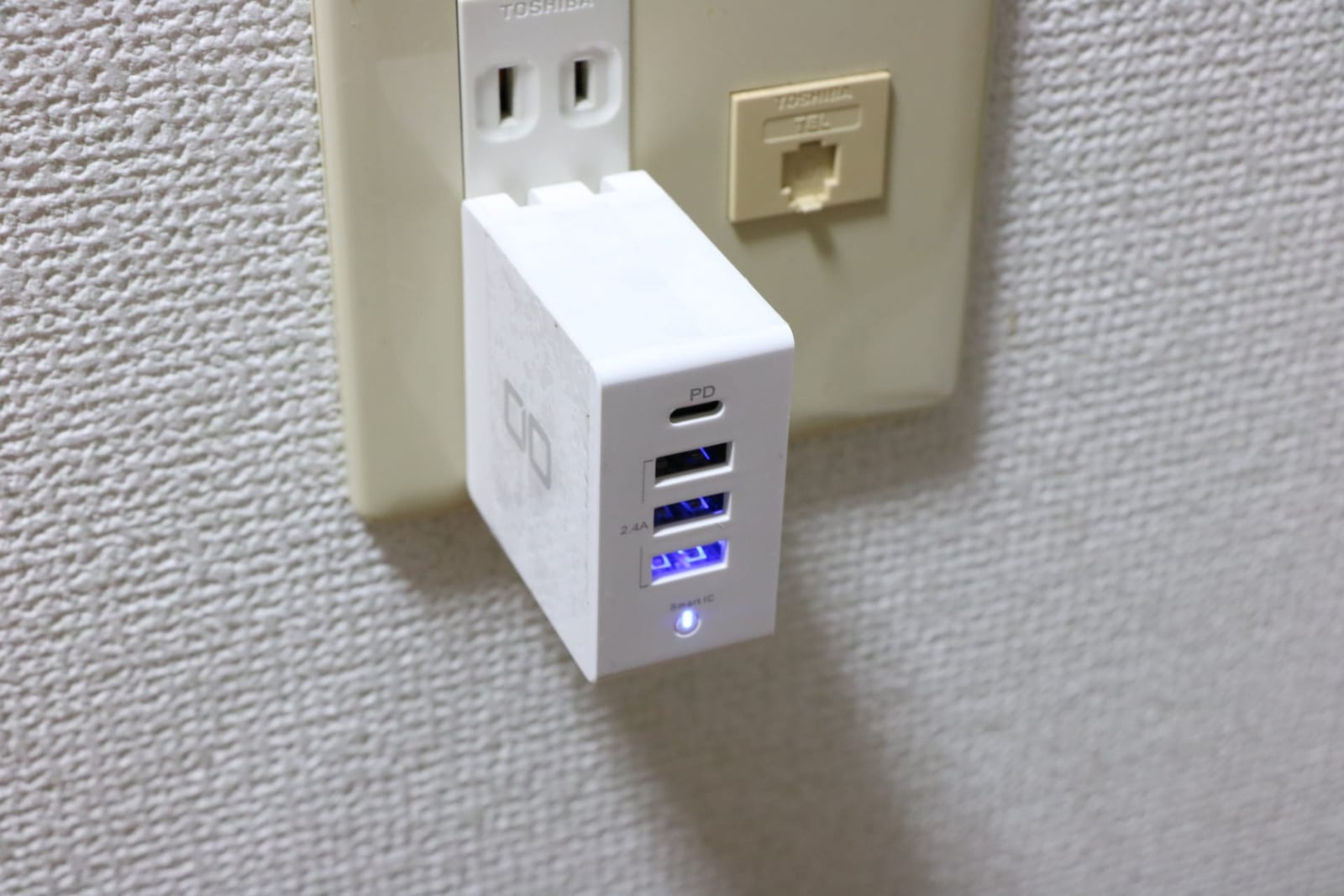 別の角度からだとこんな感じ。コンセントの上段を邪魔しない程度のサイズ感なので、使い勝手が良いです。