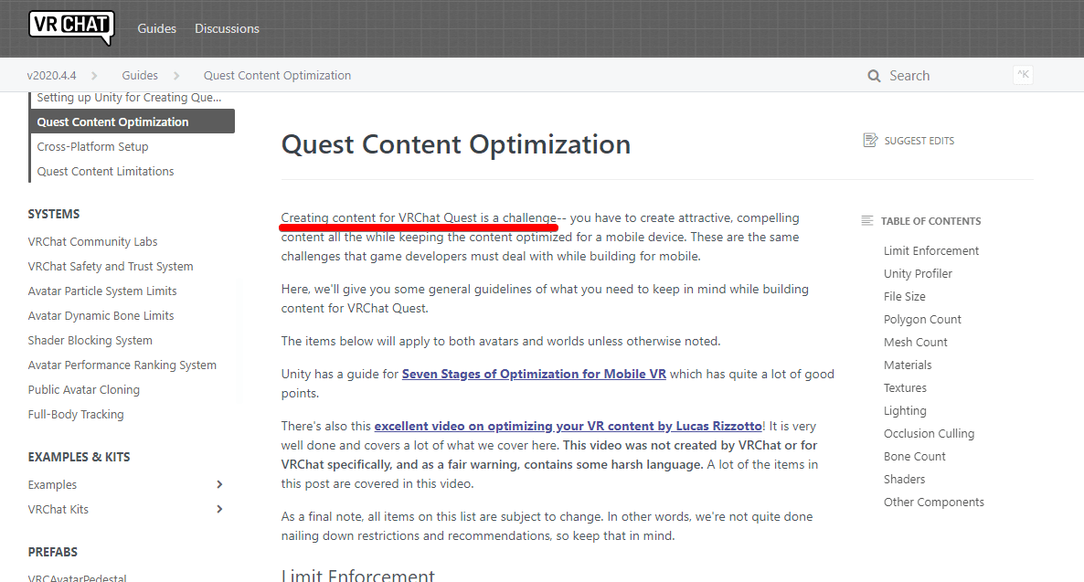 ちなみに、Quest対応化がどのくらい難しいかというと、VRChatの公式ドキュメント内のQuest対応ページの一番上に「Creating content for VRChat Quest is a challenge(VRChat Quest用のコンテンツを作成するのは難しい)」と運営チームが書いているくらい難しいのです。