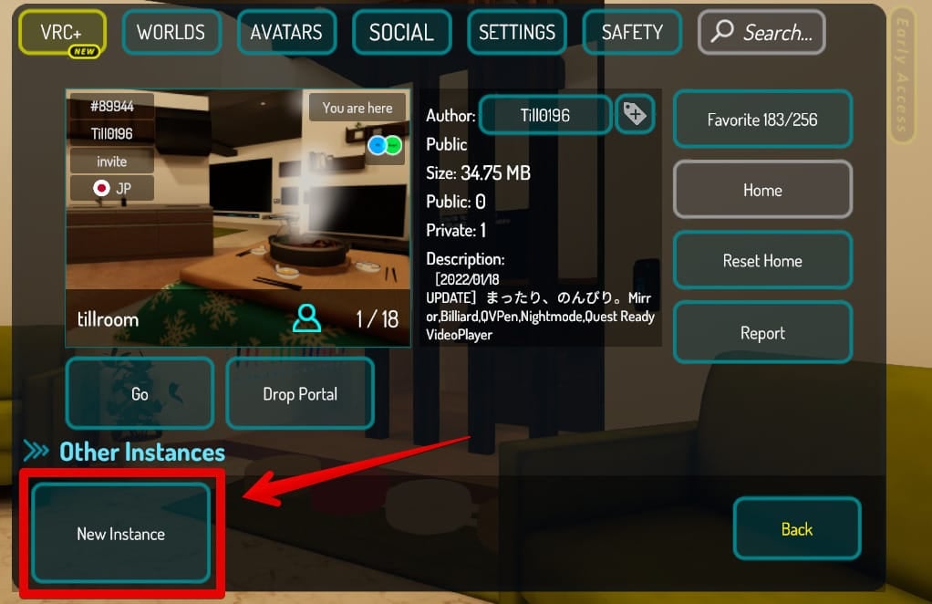 行きたいワールドを選んで「New Instance」から「Invite Only」を選んで、新しく作られたインスタンスに「Go」をすれば、知らない人は居ないし入ってこない、あなただけの世界です。
