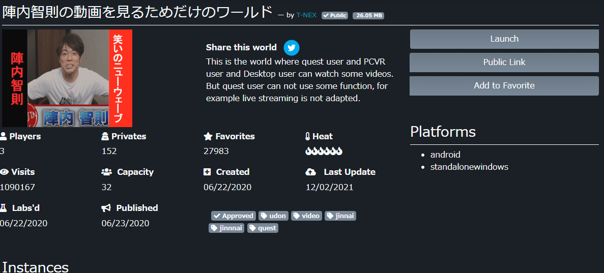 もともと、「お笑い芸人の陣内智則の動画をみんなで見よう」というコンセプトのワールドで、動画プレイヤーと陣内智則の動画が簡単に再生出来るというだけのワールドでした。