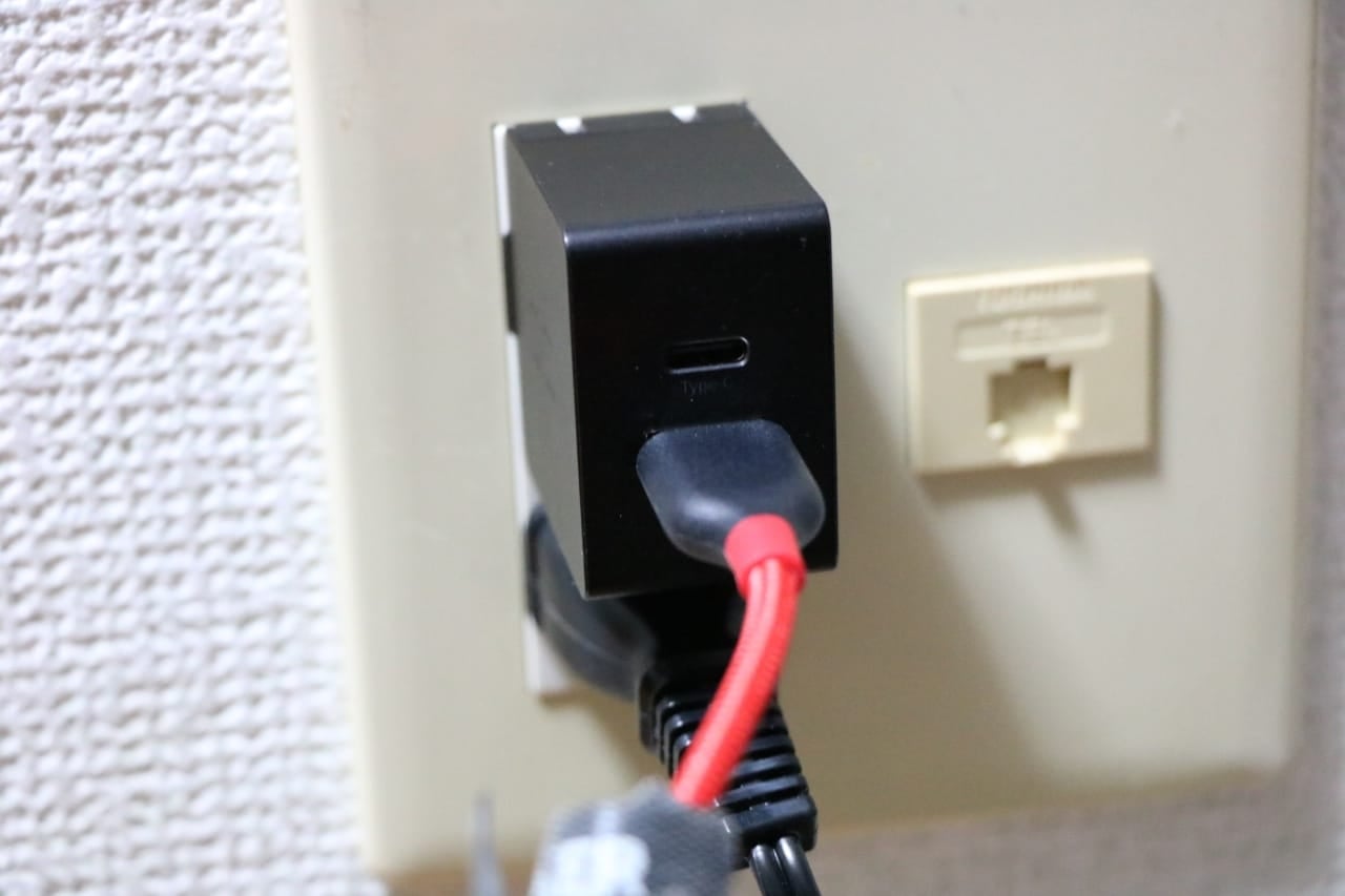 別の角度からだとこんな感じ。コンセントの他の段を邪魔しない程度のサイズ感なので、使い勝手が良いです。