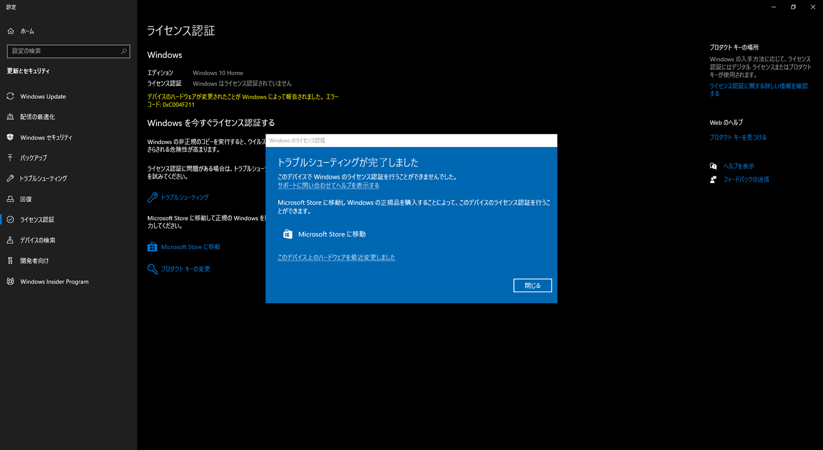 新構成だと、起動だけではライセンス認証を突破できないので、トラブルシューティングをクリックして、「このデバイス上のハードウェアを最近変更しました」から前のPCを選択すると、無事ライセンス認証出来ました。