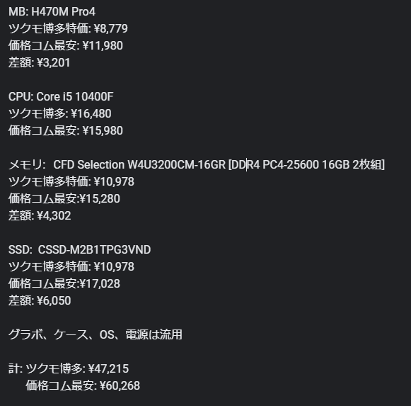 まとめた中から、オープンセールで買う場合、現時点で同じパーツをネット最安値で買う場合を比較してみました。