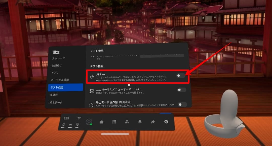 今回のアップデートでは、初代Oculus Questは公式的には非対応という状態で、Quest 2のようにテスト機能のメニューにAir Linkを有効化するトグルが用意されていません。