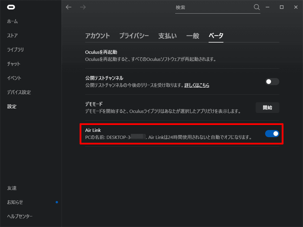 Oculus ソフトウェアの「設定」→「ベータ」→「Air Link」を有効化します。