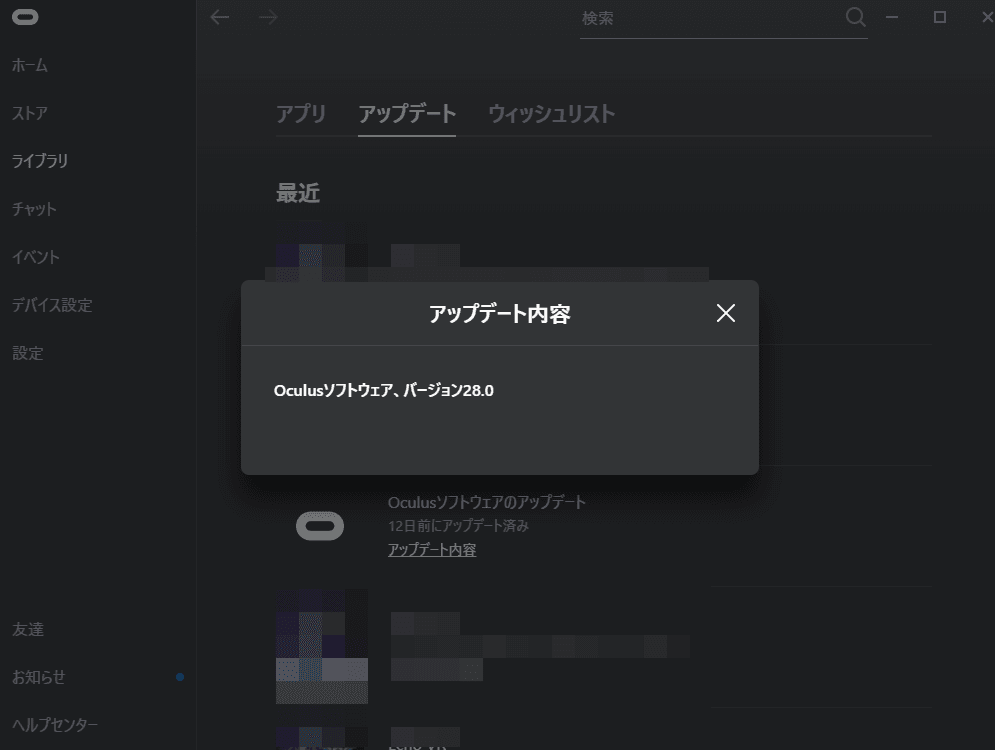「ライブラリ」→「アップデート」→「Oculusソフトウェアのアップデート」からバージョンが確認出来ます。