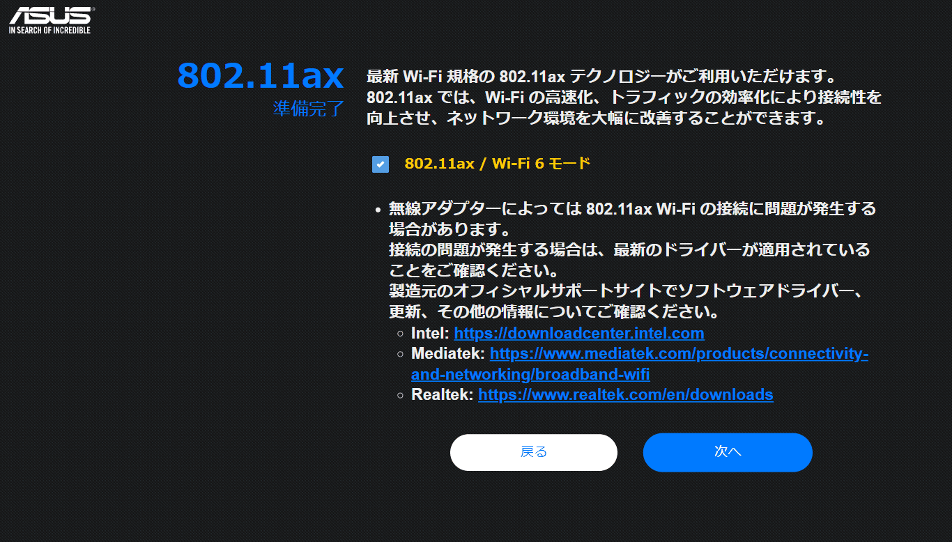 Wi-Fi6(ax)を有効にするのかという選択肢がありますが、自動設定のWi-Fi6モードは何故かWi-Fi6非対応機種で接続できない問題があるので、Wi-Fi6対応機種を持っていない場合は一度チェックを外したほうが良いかもしれません。