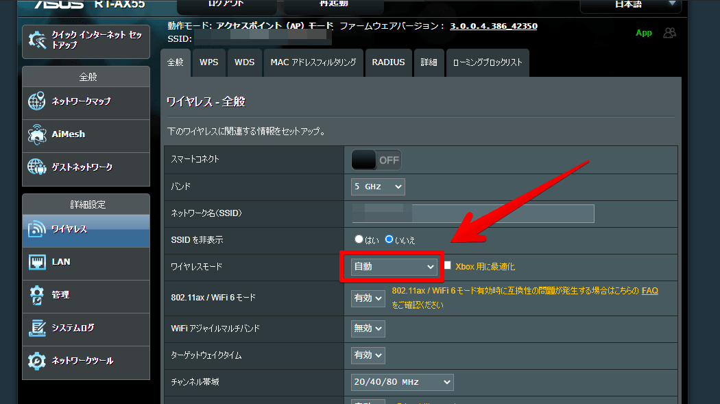 クイックセットアップでWi-Fi6を有効化するとワイヤレスモードが自動になって、ax/WiFi 6モードが有効になるのです。