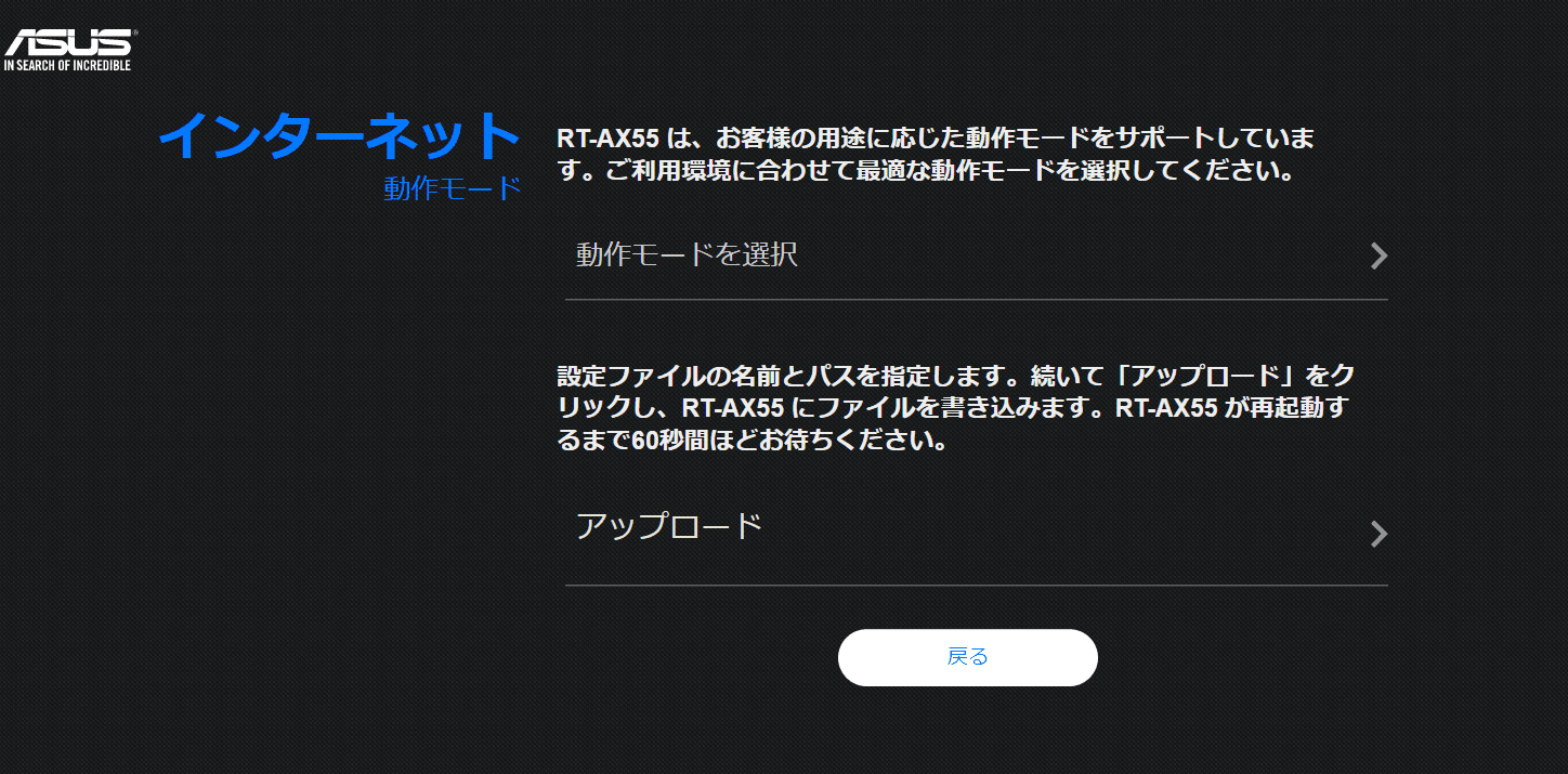 この動作モードを選択で、ルーターモードやメッシュモードなどが選択出来ます。