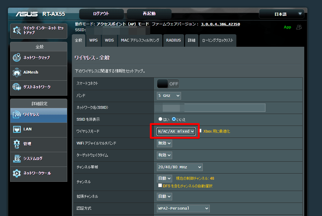 クイックセットアップでWi-Fi6を有効化すると何故か5Ghzのacモードを吹かなくなるので、それに対応する方法です。