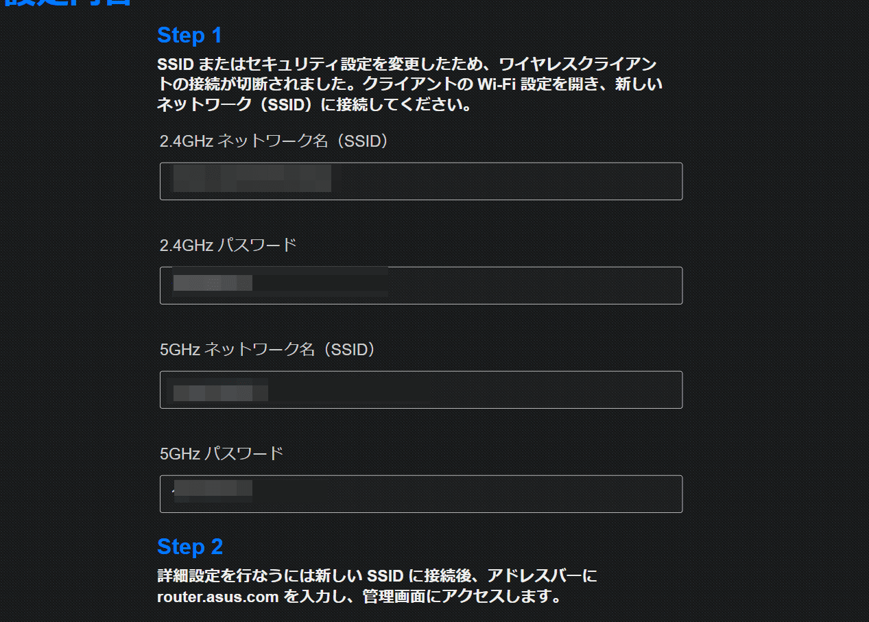 ファームウェアアップデートが終わるとSSIDとパスワードが表示されます。