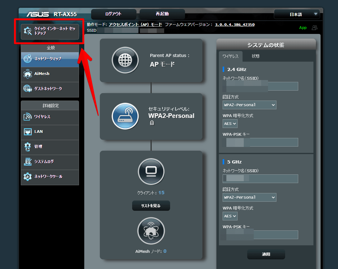 Asusのルーターの場合、アプリでも設定出来るようですが、ONUにルーター機能を任せてアクセスポイントモードで動かしたかったので、PCでウェブブラウザ上で設定しました。