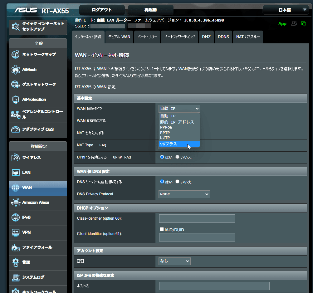 何故かASUSの公式サイト内のファームウェアアップデート情報から消えていますが、過去のアップデート(3.0.0.4.386_43597)でIPv4 over IPv6やv6プラスに対応しています。