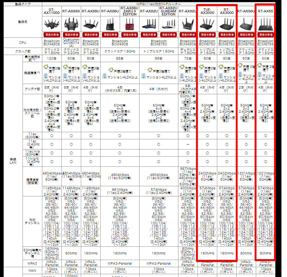 もうワンランク上(搭載CPUがBroadcom 6750 1.5GHz トリプルコア)だと1.4万円-2万円くらいら入手出来るRT-AX3000と、ASUSのゲーミングブランドTUFシリーズのTUF-AX3000も候補となりそうです。この2機種は値段がそれぞれ上がったり下がったりしているので、安い方を買えば良いと思います。