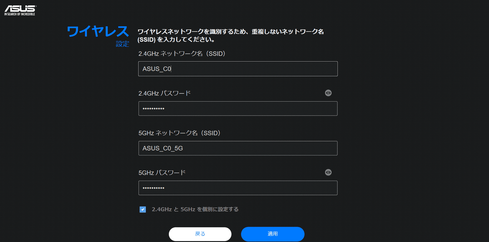 2.4Ghzと5Ghzで同じSSIDにすることも出来ますが、Virtual Desktopで使う上では5Ghzであることがほぼマストなので、自分は別々のSSIDになるように設定しました。