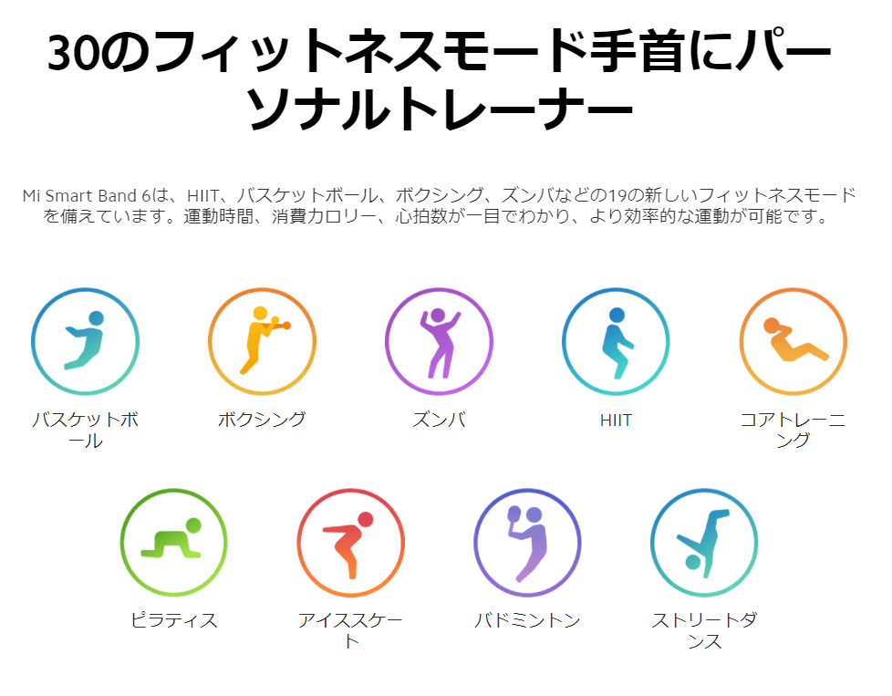 Mi Fitからは本体内蔵の種目以外のスポーツが選べていましたが、Mi Band 6からは内蔵のフィットネスモードから30種類もの種目が選択が出来るようになりました。