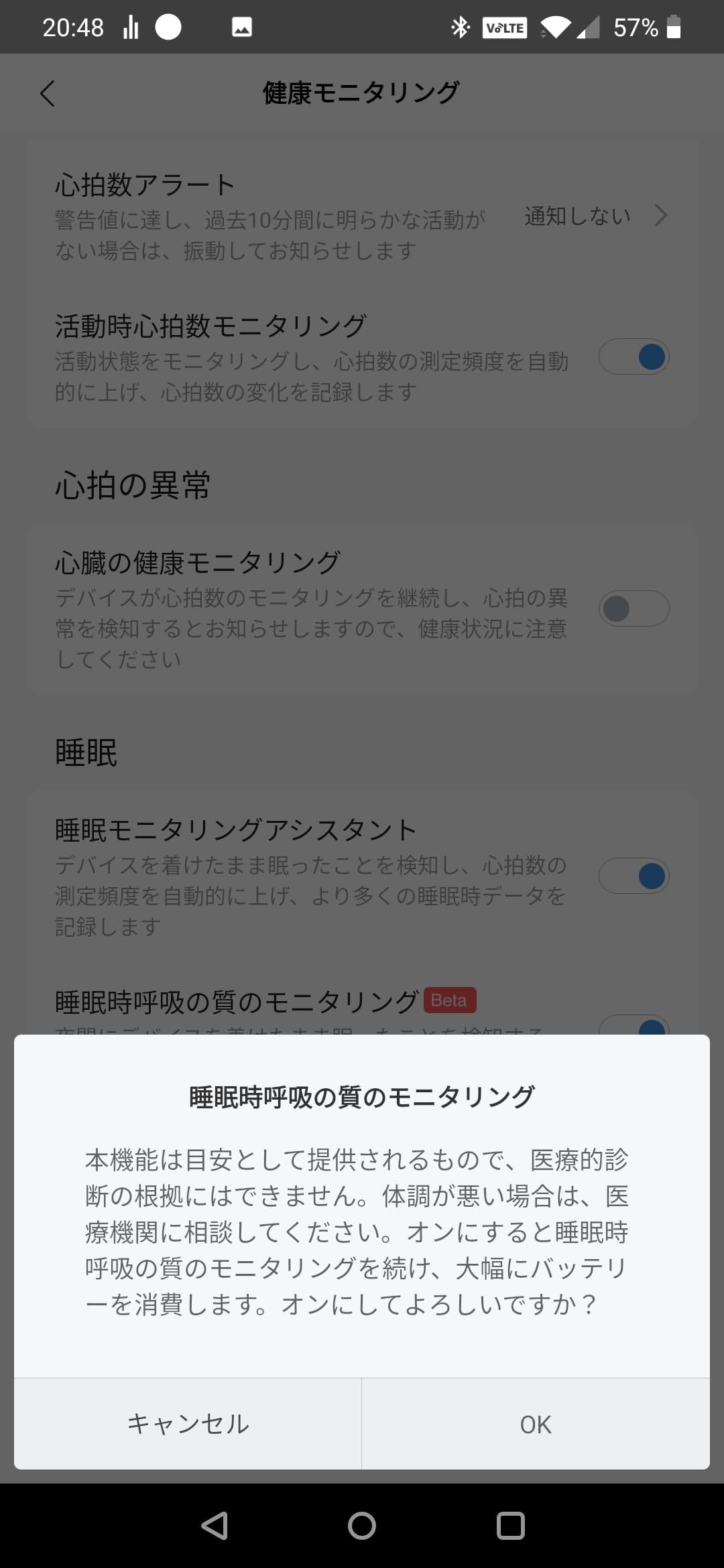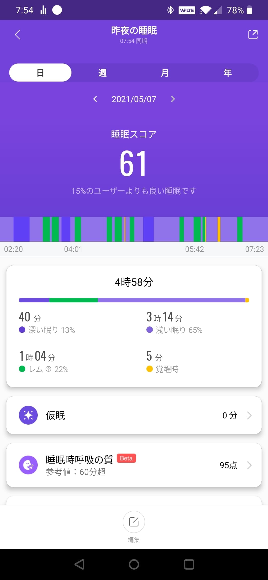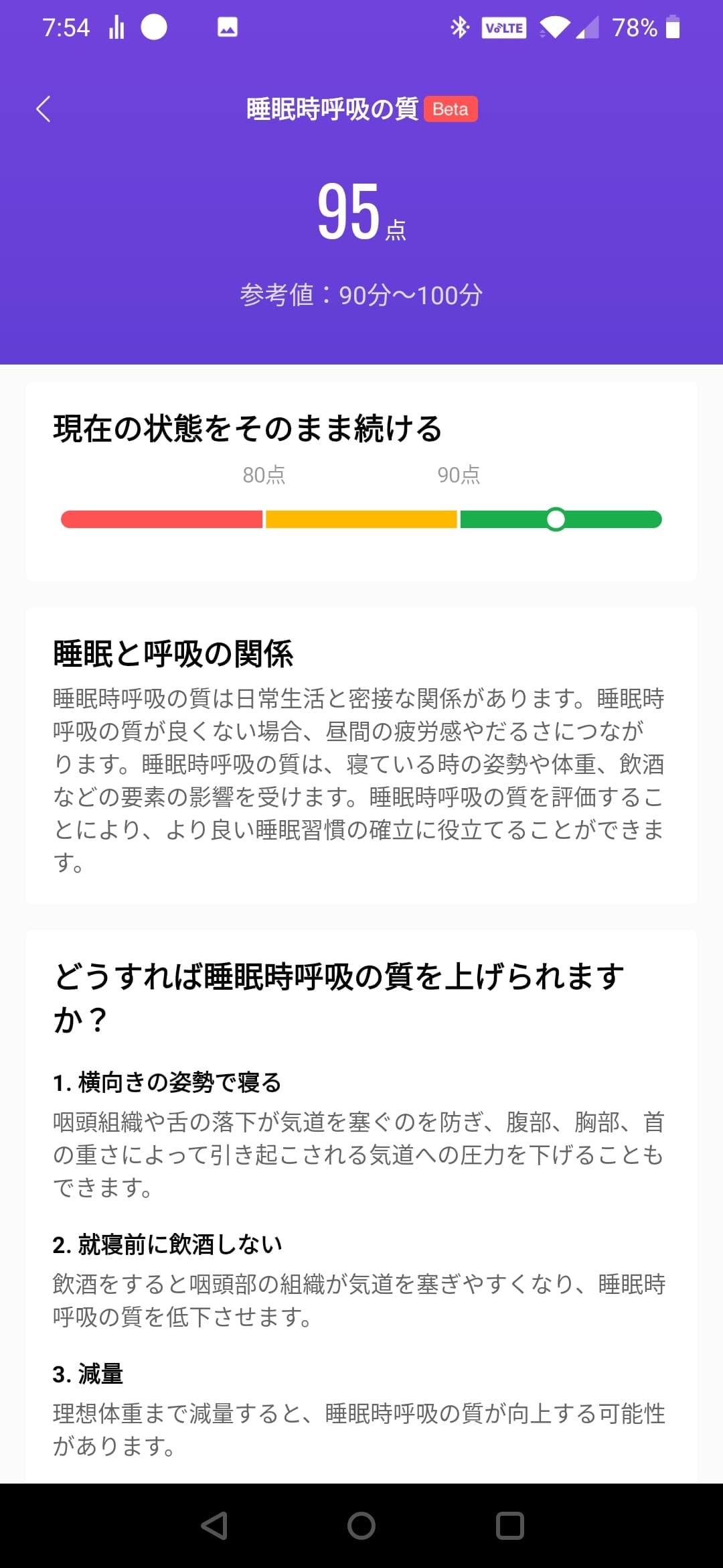 また、ベータ版機能として睡眠時呼吸の質という項目が追加されました。正直どのセンサーで計測しているのかよくわからないのですが、睡眠時無呼吸症候群の場合は、このスコアが低く表示されるようです。