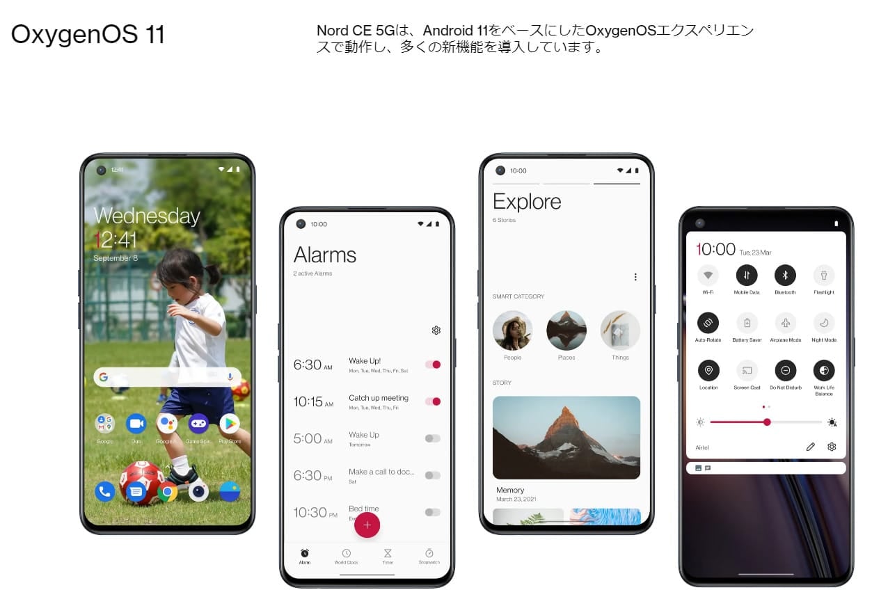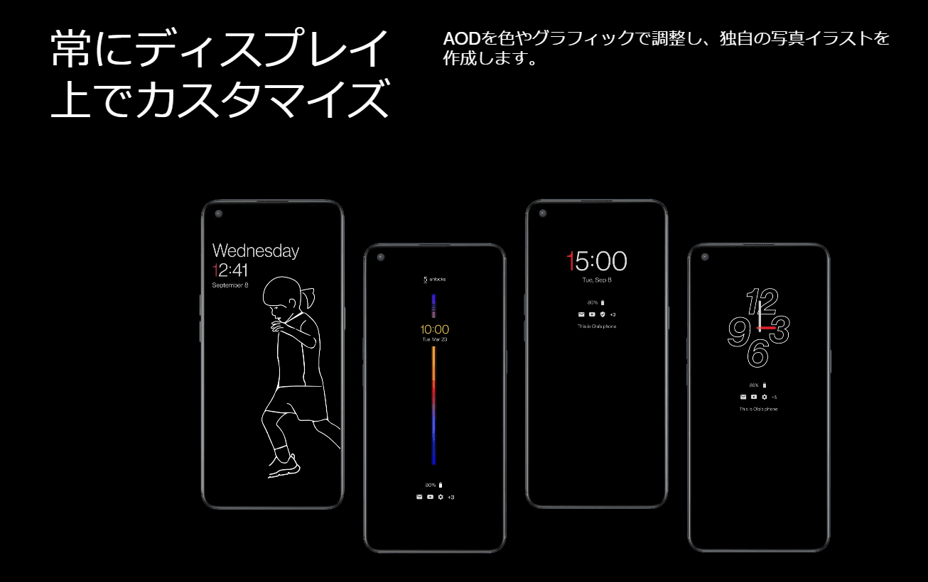 その特徴を活かし、OnePlusシリーズに搭載されているOxygenOSではAOD画面と呼ばれる、画面を傾けるだけで通知や時計などを表示する機能を標準で搭載しています。