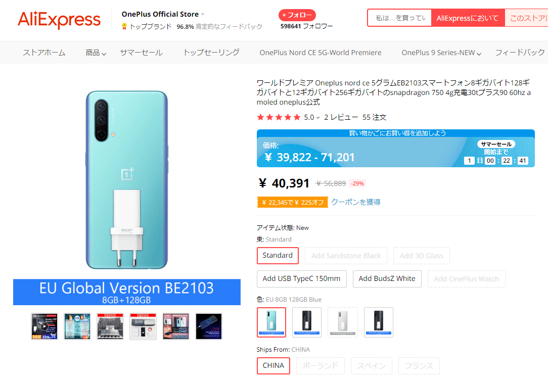 Aliexpressにて、専用クーポンページでクーポンをゲットするとOnePlus Nord CE 5GのROM:128GB RAM:8GBモデルが309ドル(35,257円)から購入できます!