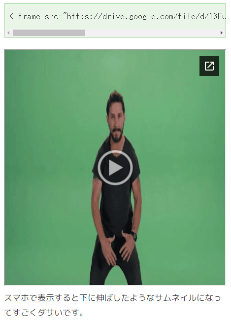 <iframe src="https://drive.google.com/file/d/16Eu8qvqEwhnn_r3C9QfVz3VC5cSvLzYb/preview" width="640" height="480" allow="autoplay"></iframe>これをスマホで表示すると下に伸ばしたようなサムネイルになってすごくダサいです。