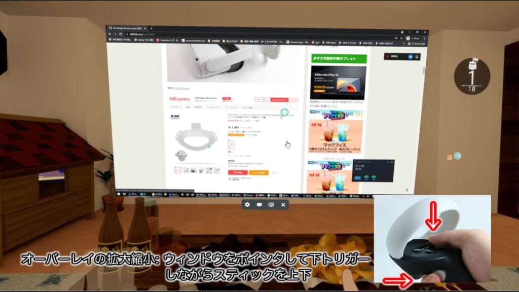 ウィンドウの中にポインタを合わせて、下トリガーを引きながらスティックを上下するとオーバーレイが拡大縮小します。