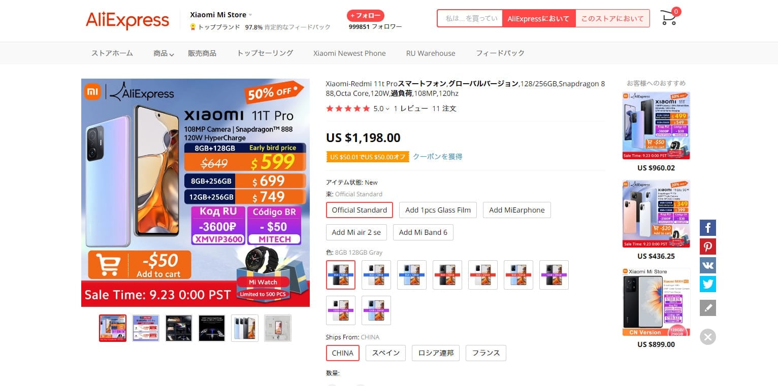 Aliexpressでは、9/23 16時からセールが開催され、128GB/8GBモデルが499ドル(約5.5万円)で購入できます!
