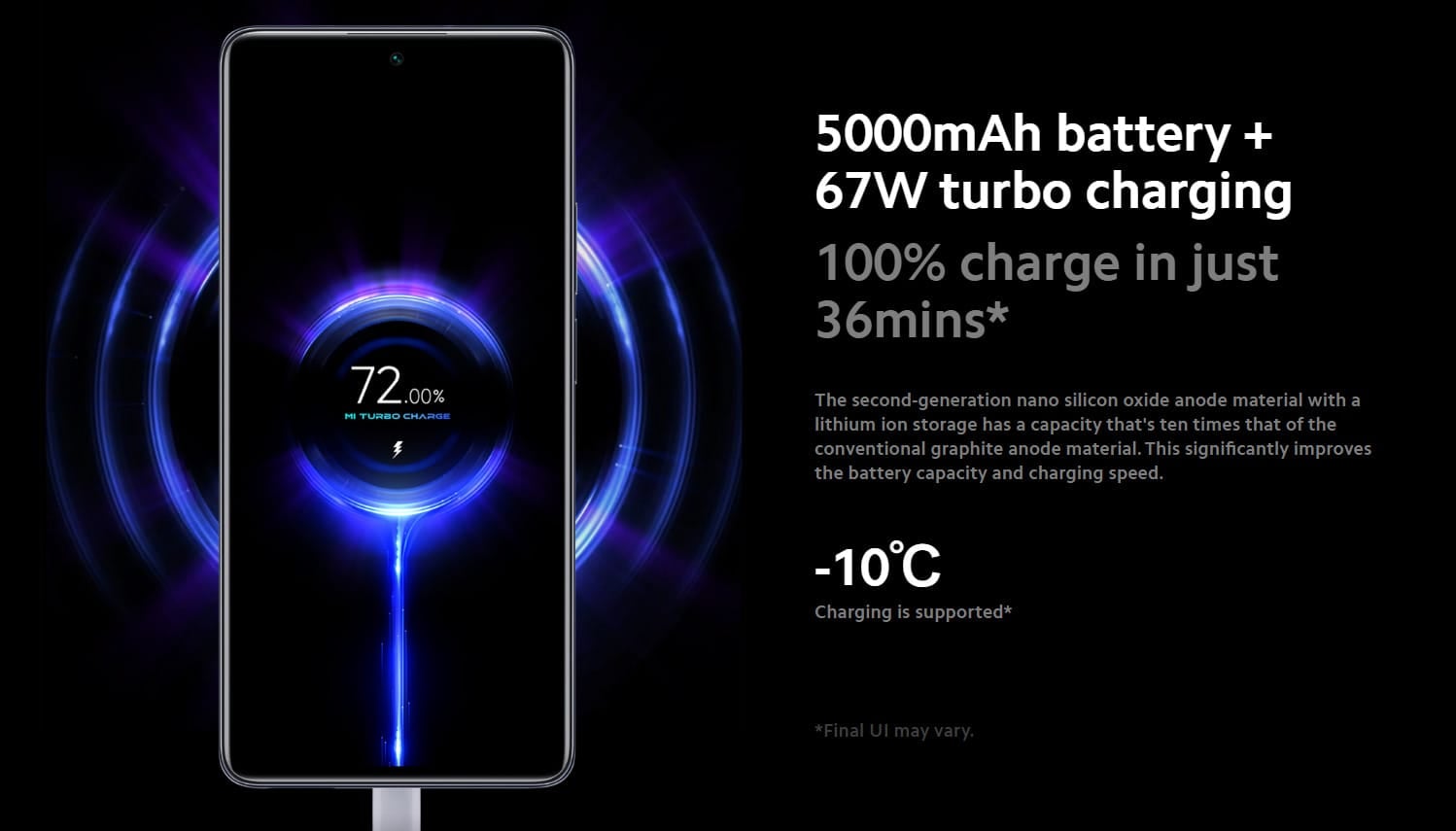 また、67Wの高速充電にも対応しているので、100%まで充電するのに36分しか掛からないとのこと。