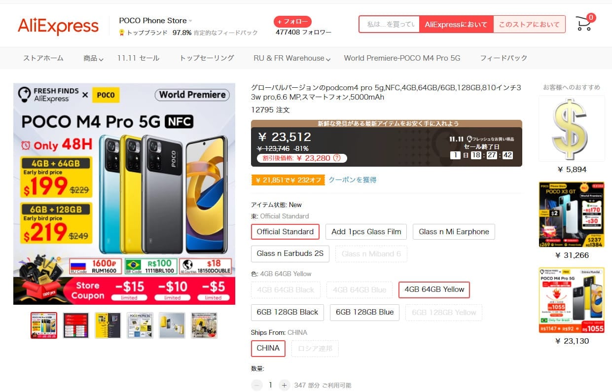 新発売のPOCO M4 Pro 5Gが安い!Aliexpressにて、64GB/4GBモデルが199ドル(約2.3万円)から購入できます!