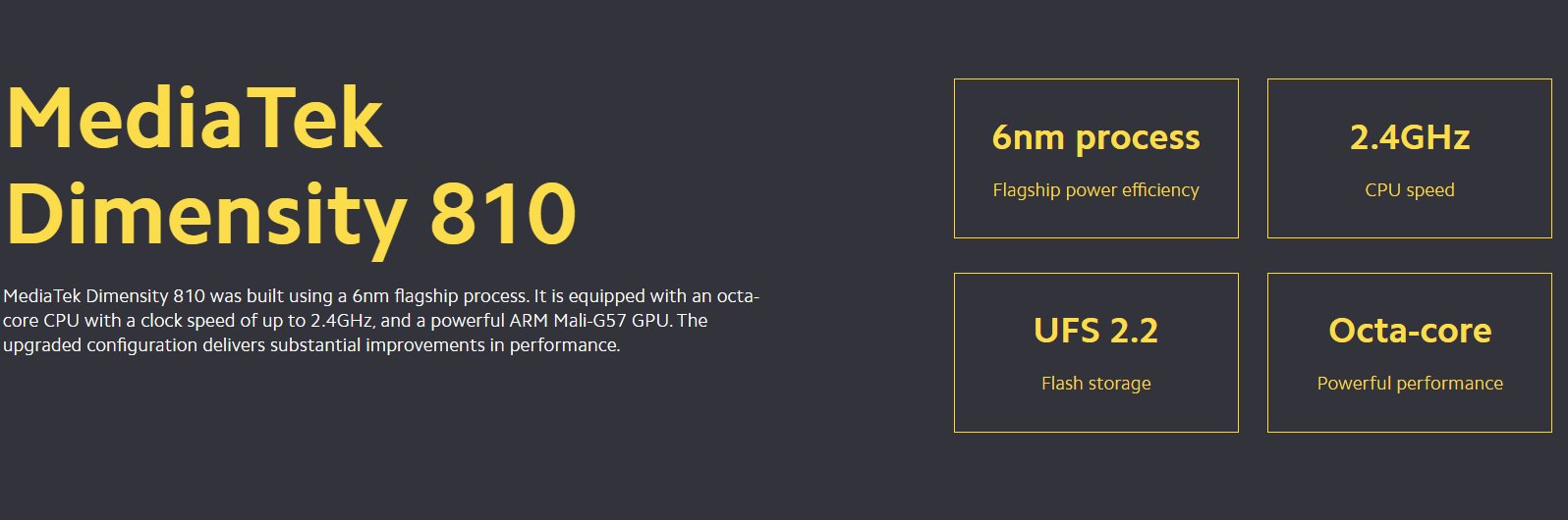 MediaTekのラインナップの中ではハイエンドの Dimensity 810を搭載し、3D描写の多い重たいゲームは描写設定を下げる等の対策が必要ですが、一般利用において困ることはない性能です。