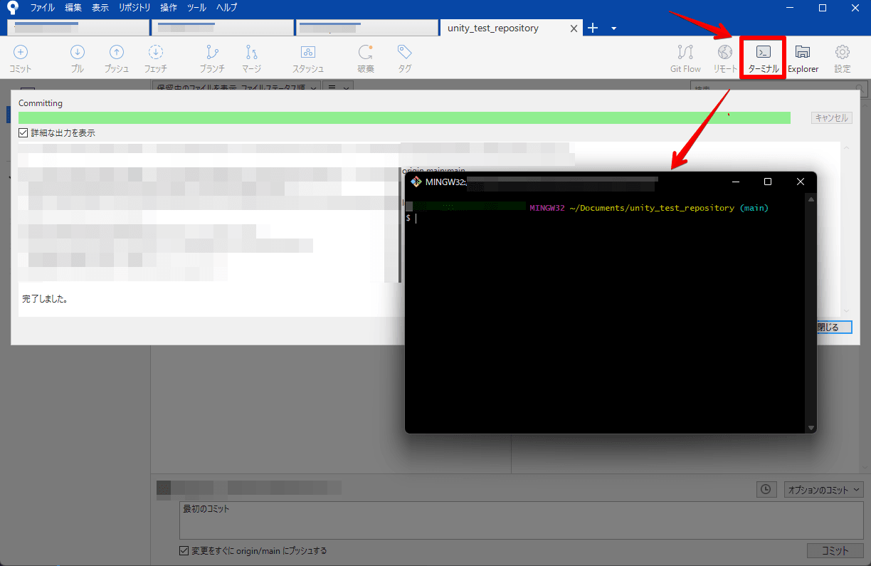 ここまで設定が出来たら、Git管理下のフォルダにUnityプロジェクトデータをコピーするか、シンボリックリンクを作成して、ファイルをコミットしてプッシュしましょう。