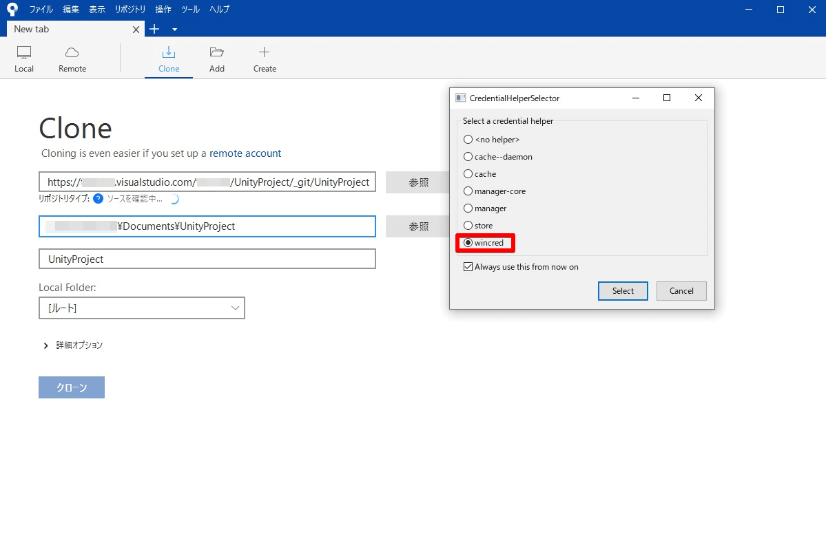 クローンボタンを押して、待っているとCredentialHelperSelectorというのが表示されます。
