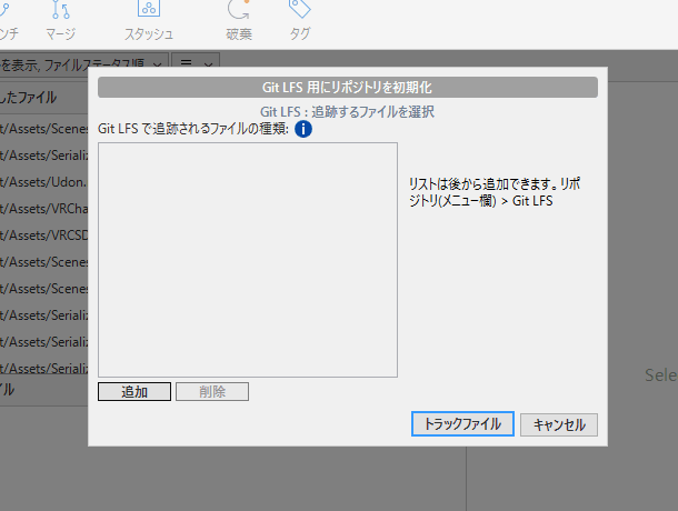 なにも設定していなくても、一応Sourcetreeが容量が大きいことを検知して、GitLFSに追加するか聞いてくることがあります。