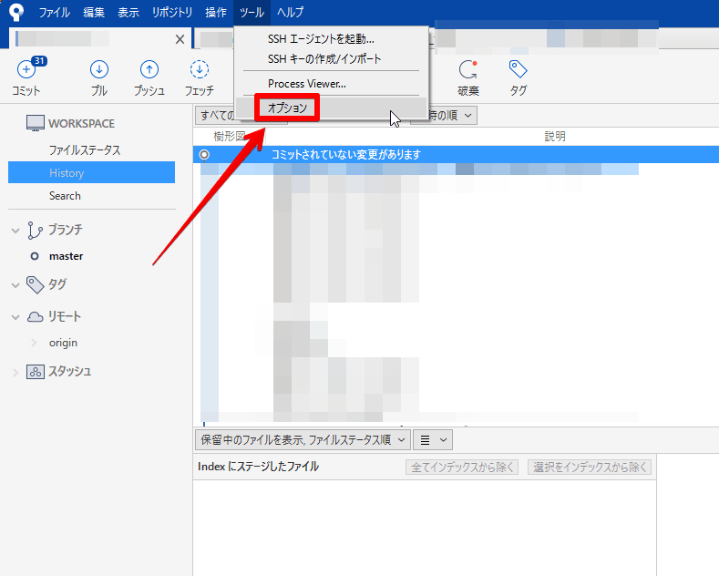 Sourcetreeを開き、「ツール」から「オプション」を開いてログイン情報を入力していきます。