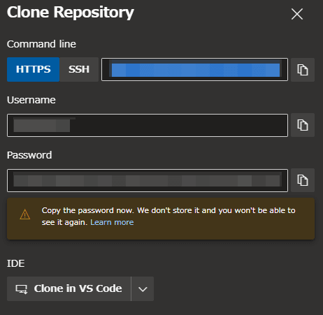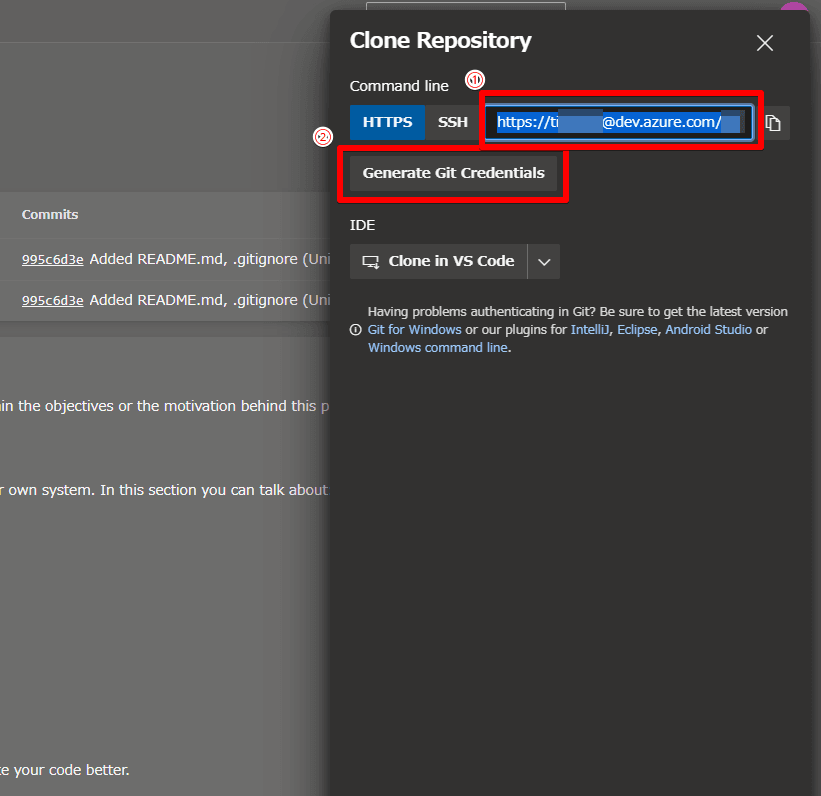 ここでのユーザー名とパスワードは、先程Azure DevOpsでメモ帳などのテキストエディタにコピーしたユーザー名とパスワードです。