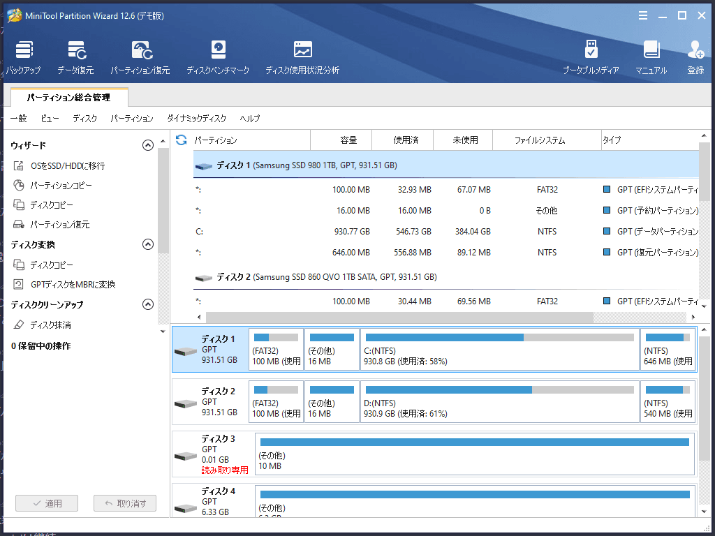 Windows標準の機能である「ディスクの管理」を拡張したようなソフトなのですが、それに比べると見やすいUIになっています。