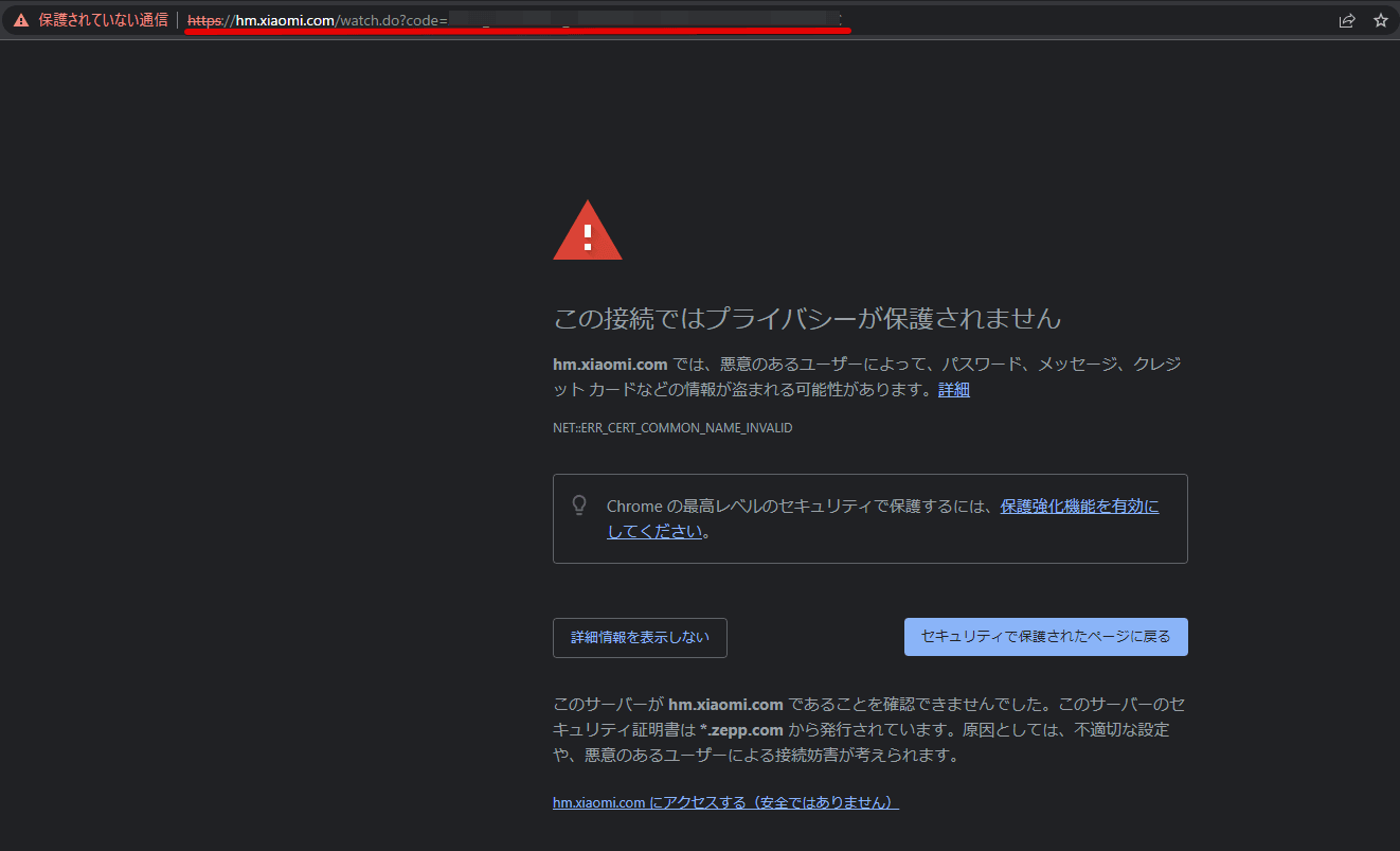 「この接続ではプライバシーが保護されていません」という警告が出ていますが、このページ自体は意味がなく、URLが重要です。このURLをコピーして先程のターミナルにペーストします。