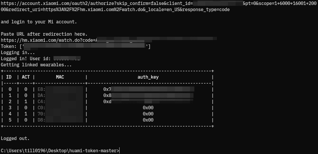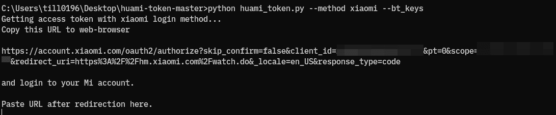 python huami_token.py --method xiaomi --bt_keys 続いて上の文字列をコピペし、エンターを押します。