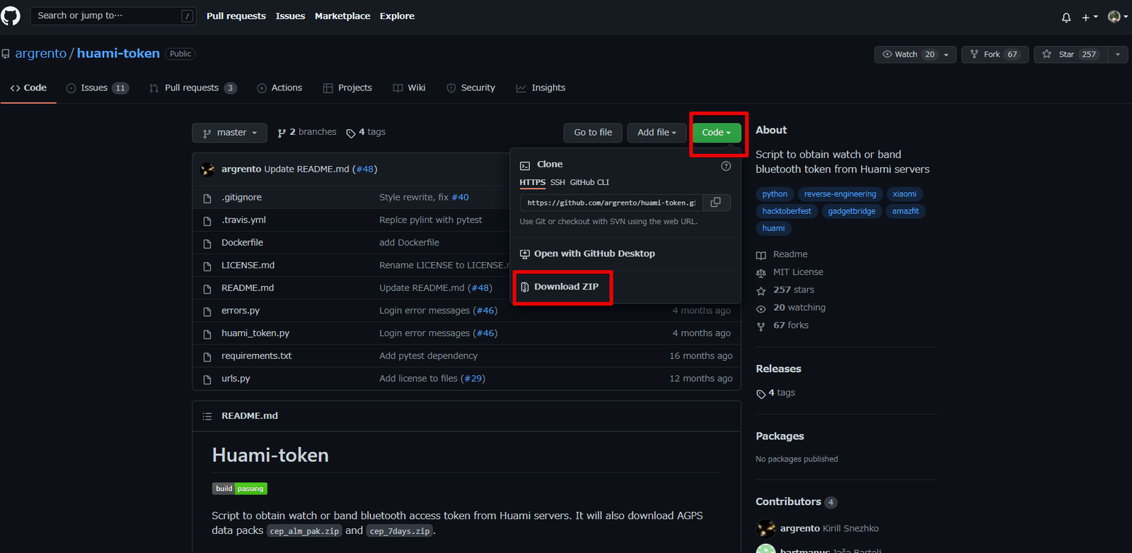 argrento氏が作成したhuami-tokenをダウンロードします。
