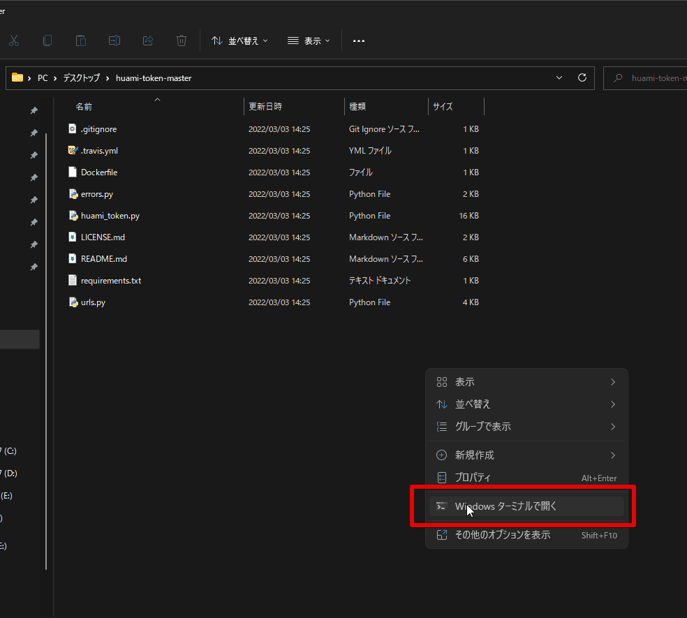フォルダーで右クリックして、「Windowsターミナルで開く」をクリックします。