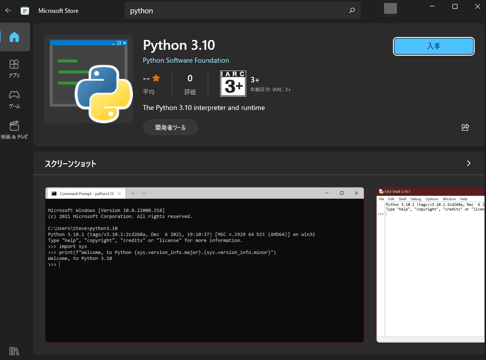 WindowsのMicrosoft Storeから「Python」と検索し、Pythonをインストールします。