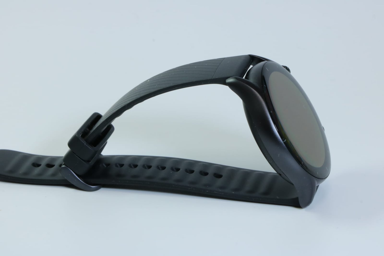 ディスプレイ部分は隅が少しラウンドしています。Amazfit製品に共通していることですが、非表示領域と表示領域の境目がハッキリとわからないようなデザインになっています。