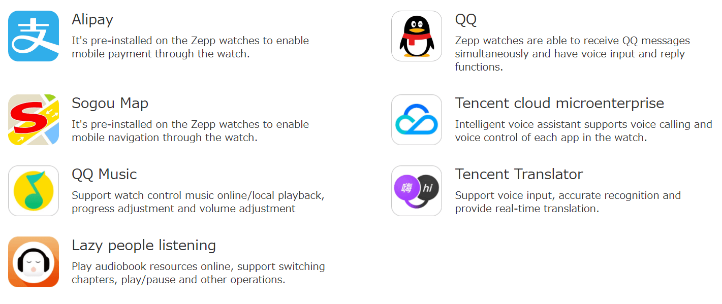 管理アプリであるZepp内に用意されたアプリストアからアプリが追加可能です。現時点ではZepp公式が用意したアプリのみですが、今後はサードパーティにも開放されるそうです。Webアプリベースらしく、SDK等も準備されています(申請制)。